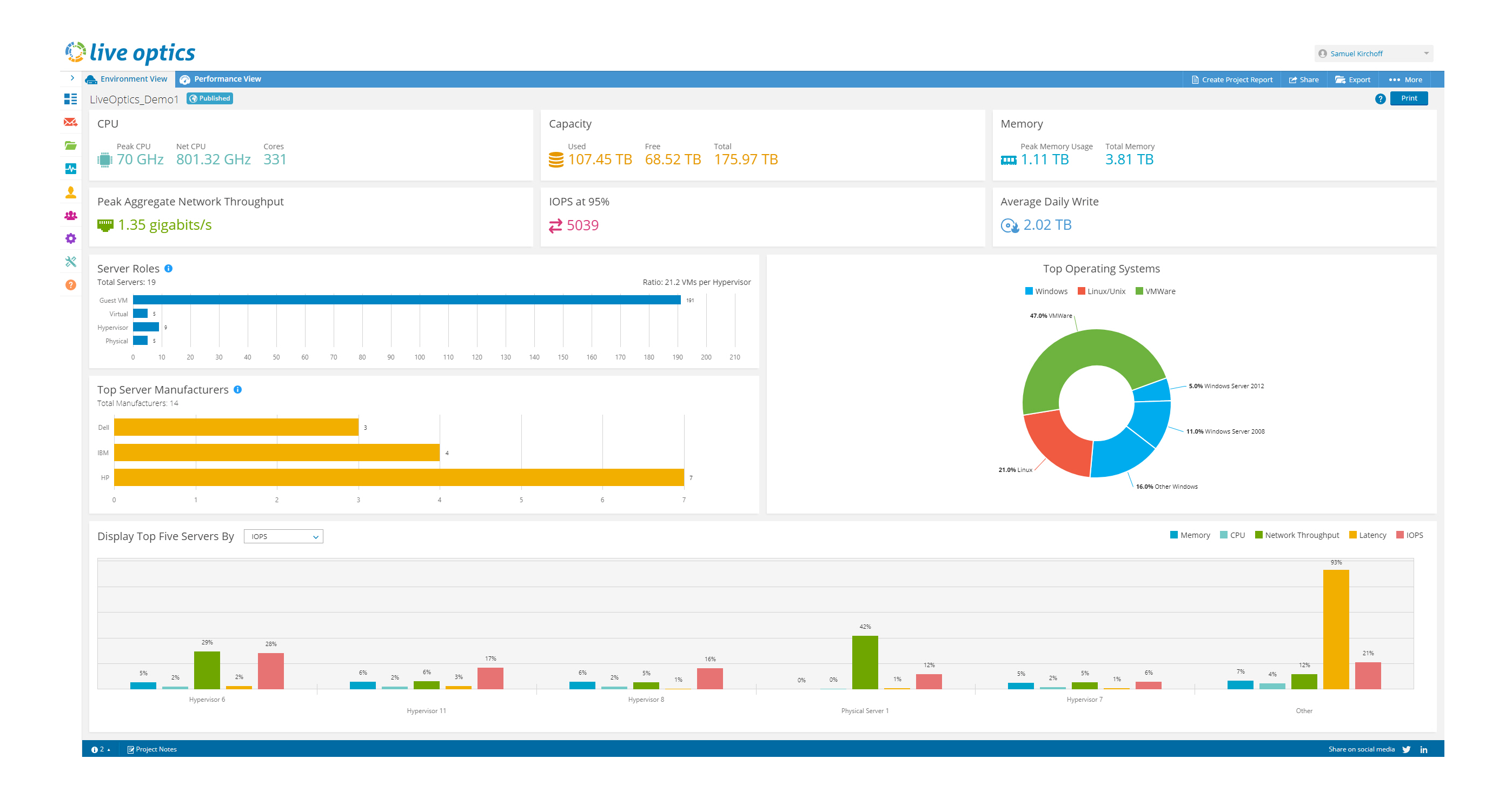 Live Optics 控制面板给予了您的 IT 环境及工作负载的清楚、准确的视图,让您可以掌控一切。